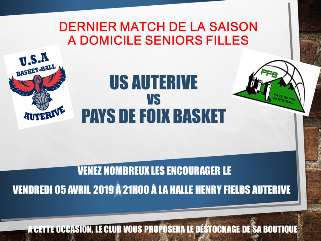 Nos Seniors Filles joueront leur dernier match à domicile Vendredi 05 Avril 2019 à 21 heures.